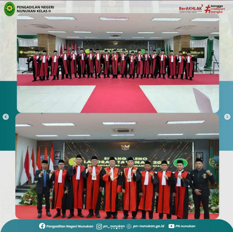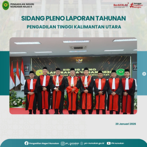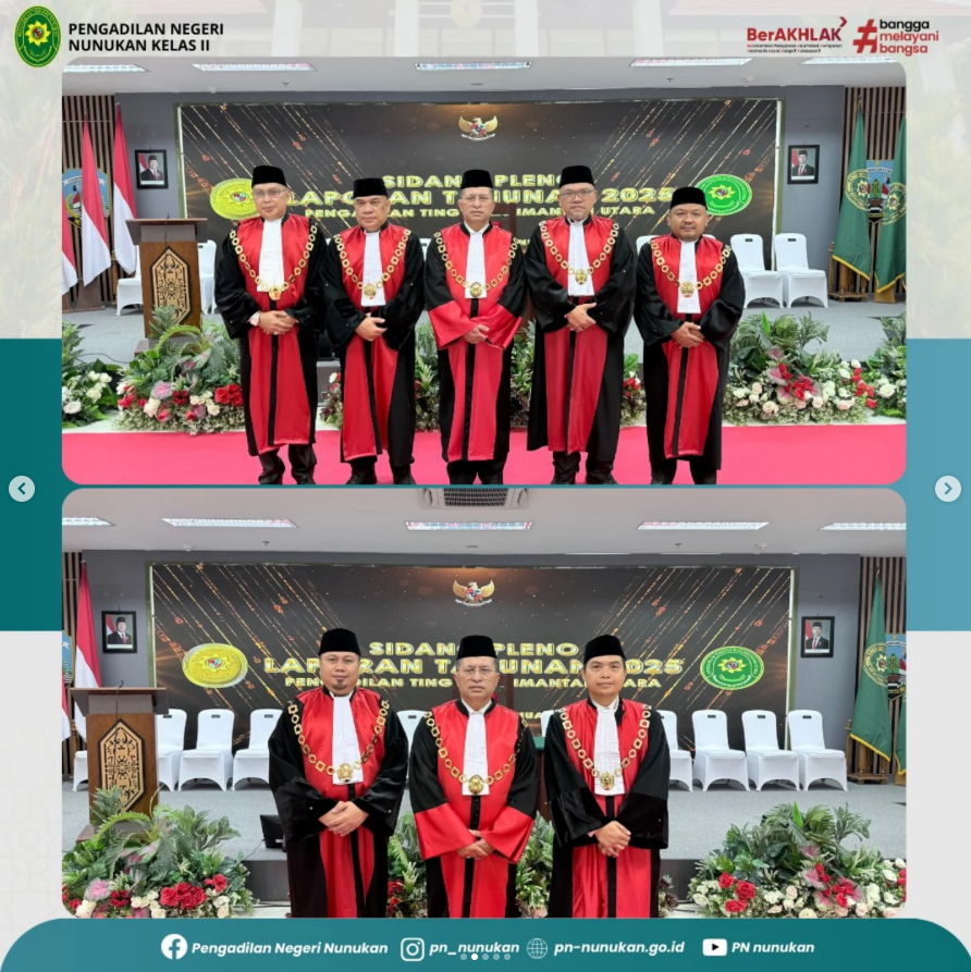 nukan menghadiri kegiatan Sidang Pleno Laporan Tahunan 2025 Se Wilayah Hukum Kalimantan Utara yang digelar oleh Pengadilan Tinggi Kalimantan Utara bertempat di Aula Gedung Kantor Gubernur Kalimantan Utara, Tanjung Selor. Acara ini secara resmi dibuka oleh Ketua Pengadilan Tinggi Kalimantan Utara Dr. Marsudin Nainggolan, S.H., M.H. dan dihadiri oleh berbagai pejabat penting termasuk Ketua, Wakil Ketua, Panitera, dan Sekretaris Pengadilan Negeri dari seluruh wilayah hukum Kalimantan Utara, turut memberikan kehadiran yang memperkuat makna penting sidang pleno ini.