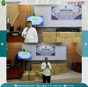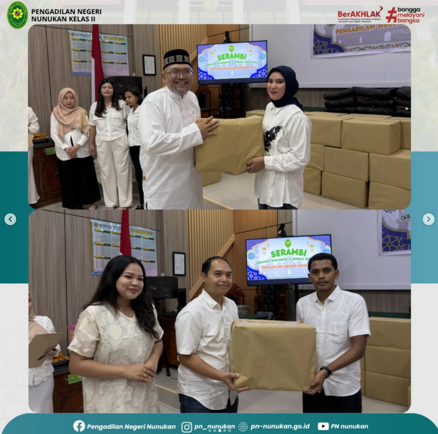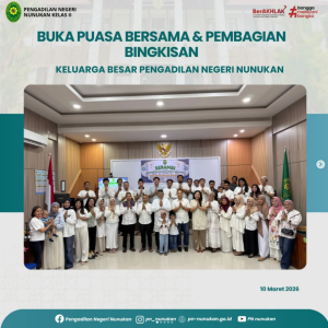 Menjelang penghujung bulan suci Ramadhan, keluarga besar Pengadilan Negeri Nunukan menggelar kegiatan buka puasa bersama yang berlangsung dengan penuh kehangatan dan kekeluargaan. Kegiatan yang dilaksanakan di Ruang Sidang Utama Pengadilan Negeri Nunukan tersebut dihadiri oleh para hakim, pejabat struktural dan fungsional, aparatur sipil negara, serta pegawai honorer. Suasana kebersamaan tampak terasa sejak awal kegiatan hingga saat berbuka puasa. Acara diawali dengan sambutan dari Ketua Pengadilan Negeri Nunukan, Bapak R. Narendra Mohni I., S.H., M.H. yang menyampaikan pentingnya menjaga silaturahmi, kebersamaan, serta memperkuat nilai-nilai kebersamaan di lingkungan kerja, terlebih dalam momentum bulan Ramadan yang penuh berkah. Selain itu, kegiatan ini juga menjadi sarana untuk mempererat hubungan kekeluargaan antar pegawai. Sebelum waktu berbuka puasa, kegiatan diisi dengan doa singkat yang dipimpin oleh Bapak Supriyanto, S.H. Para hadirin tampak khidmat mengikuti rangkaian acara hingga tiba saat berbuka puasa bersama. Pada kesempatan tersebut, Pengadilan Negeri Nunukan juga memberikan bingkisan kepada Tenaga Kerja Pihak Ketiga, PPNPN, dan seluruh aparatur Pengadilan Negeri Nunukan. Momentum buka puasa bersama ini diharapkan dapat semakin mempererat hubungan kekeluargaan serta menumbuhkan semangat kebersamaan di lingkungan kerja Pengadilan Negeri Nunukan dalam menjalankan tugas dan pelayanan kepada masyarakat. Dengan terselenggaranya kegiatan ini, diharapkan semangat kebersamaan dan nilai-nilai kebajikan yang tercermin dalam bulan suci Ramadhan dapat terus terjaga, baik dalam kehidupan bermasyarakat maupun dalam menjalankan tugas sebagai aparatur peradilan. (Tim Medsos PN Nnk)