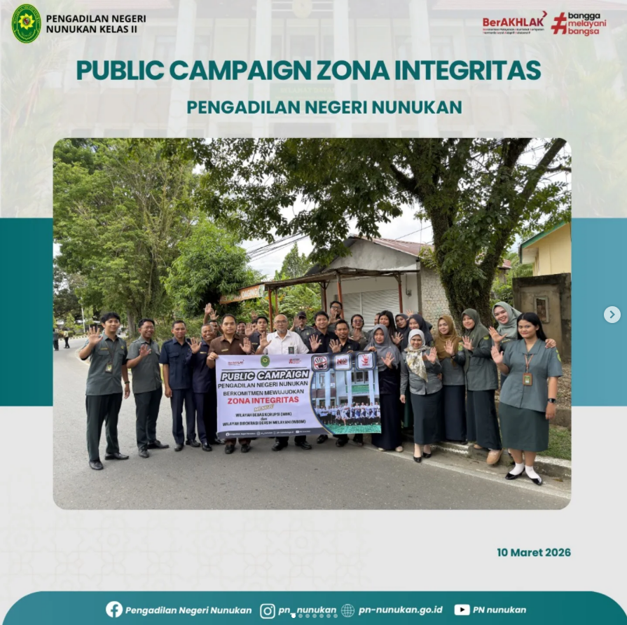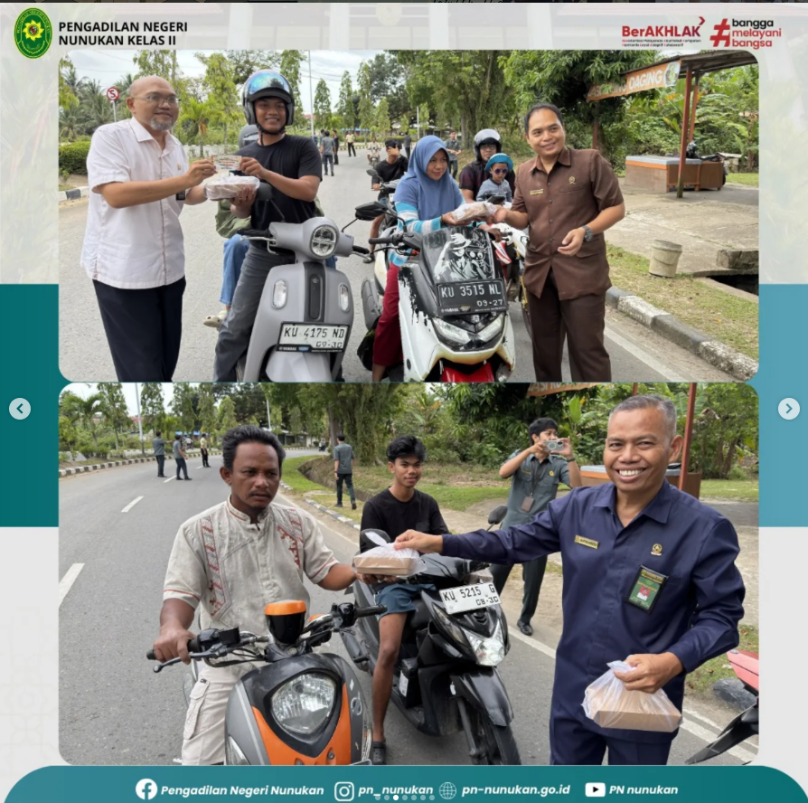 Pengadilan Negeri Nunukan kembali menunjukkan komitmen nyata dalam menjaga marwah lembaga dengan seluruh aparatur Pengadilan Negeri Nunukan turun ke jalan melaksanakan Public Campaign Zona Integritas (ZI) sebagai salah satu langkah konkret mewujudkan Wilayah Bebas dari Korupsi (WBK) dan Wilayah Birokrasi Bersih dan Melayani (WBBM). Kegiatan dilaksanakan di depan Kompleks Perkantoran Gabungan Dinas (GADIS) dan kegiatan tersebut bukan sekedar sosialisasi formal, melainkan sebuah aksi simpatik yang menyentuh masyarakat secara langsung. Sambil menyuarakan gerakan anti gratifikasi, pimpinan dan aparatur Pengadilan Negeri Nunukan juga membagikan paket takjil kepada warga dan pengendara yang melintas. Public Campaign ini dilaksanakan dengan pembagian stiker Zona Integritas anti korupsi dan anti gratifikasi guna mengajak masyarakat Kabupaten Nunukan untuk ikut berpartisipasi mengawal dan mendukung pembangunan Zona Integritas di Pengadilan Negeri Nunukan. -𝑫𝒊 𝒖𝒋𝒖𝒏𝒈 𝒏𝒆𝒈𝒆𝒓𝒊 𝒌𝒂𝒎𝒊 𝒃𝒆𝒓𝒅𝒊𝒓𝒊, 𝒕𝒆𝒈𝒂𝒌𝒌𝒂𝒏 𝒊𝒏𝒕𝒆𝒈𝒓𝒊𝒕𝒂𝒔 𝒕𝒂𝒏𝒑𝒂 𝒌𝒐𝒓𝒖𝒑𝒔𝒊 𝒅𝒂𝒏 𝒈𝒓𝒂𝒕𝒊𝒇𝒊𝒌𝒂𝒔𝒊. 𝑴𝒂𝒓𝒊 𝒃𝒆𝒓𝒔𝒂𝒎𝒂 𝒌𝒊𝒕𝒂 𝒅𝒖𝒌𝒖𝒏𝒈 𝒁𝒐𝒏𝒂 𝑰𝒏𝒕𝒆𝒈𝒓𝒊𝒕𝒂𝒔!-