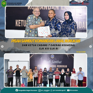 Ketua Pengadilan Negeri Nunukan, Bapak R. Narendra Mohni I., S.H., M.H menghadiri Pisah Sambut Danlanal Nunukan yang dilaksanakan di Sayn Cafe dan Resto Nunukan. Lanal Nunukan berganti pucuk pimpinan, Kolonel Laut (P) Slamet Ariyadi, S.E.,M.Tr.,Opsla yang sebelumnya bertugas di Sorong Papua sebagai Kepala Dinas Penerangan Komando Armada (Koarmada) III kini akan memimpin Lanal Nunukan sebagai Danlanal yang baru. Sementara itu Kolonel Laut (P) Primayanta Maulana Malik, S.T.,M.Tr.,Opsla yang selama ini bertugas sebagai Danlanal Nunukan akan berpindah tugas sebagai Wadan Denma Mabesal di Jakarta.