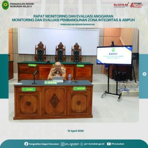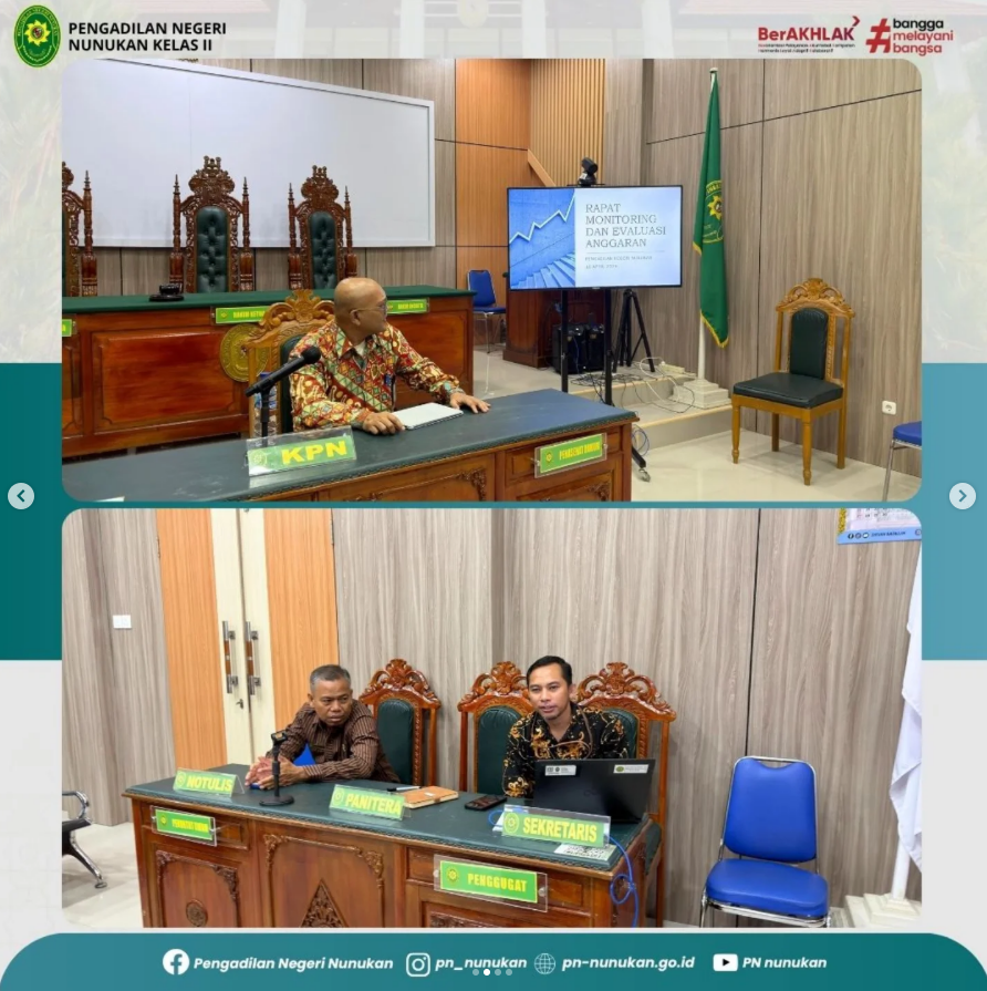 Pengadilan Negeri Nunukan melaksanakan Rapat Monitoring dan Evaluasi Anggaran yang dipimpin oleh Ketua PN Nunukan, R. Narendra Mohni I, S.H., M.H., serta dihadiri oleh seluruh Hakim dan ASN. Rapat membahas pengawasan dan evaluasi kinerja pada seluruh bidang, serta persiapan pemenuhan dokumen Zona Integritas (ZI) dan AMPUH sebagai upaya peningkatan kualitas pelayanan dan integritas satuan kerja.