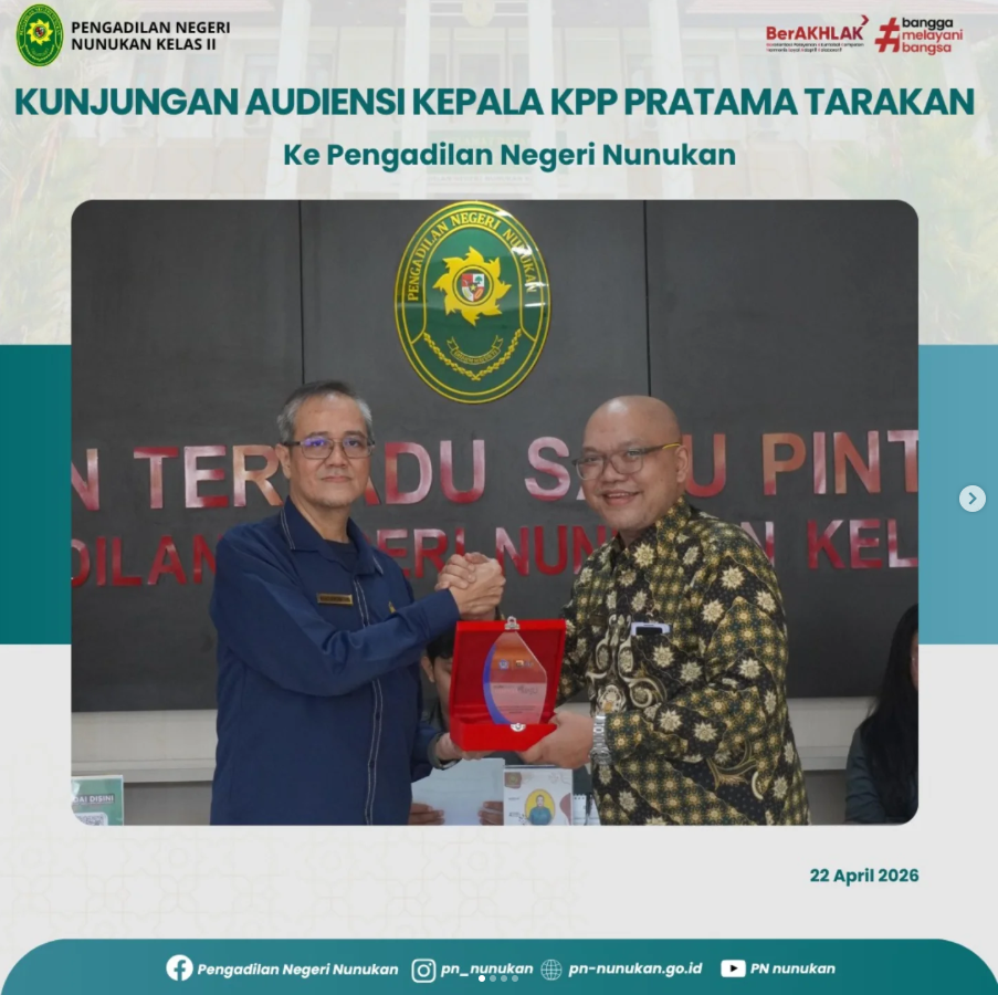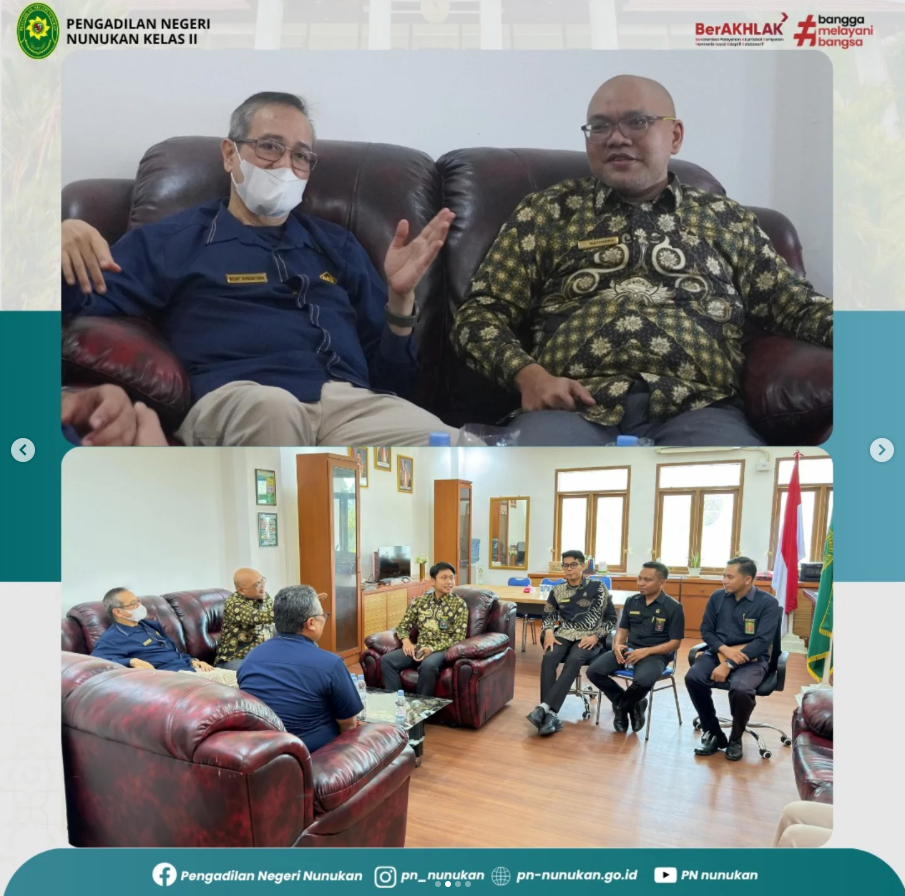 Ketua Pengadilan Negeri Nunukan, Bapak R. Narendra Mohni I., S.H., M.H. menerima kunjungan dari Kepala KPP Pratama Tarakan, Bapak Ricky Dirgantara beserta jajaran. Pertemuan ini menjadi sarana untuk mempererat hubungan kelembagaan sekaligus berdiskusi mengenai langkah strategis dalam memperkuat koordinasi dan kepatuhan perpajakan di lingkungan lembaga peradilan. Agenda kunjungan KPP Pratama Tarakan ini merupakan bentuk peningkatan sinergi di bidang Penegakan Hukum dengan pemangku kepentingan di wilayah kerjanya. Ketua Pengadilan Negeri Nunukan turut menyampaikan apresiasi yang begitu tinggi atas kedatangan pihak KPP Pratama Tarakan ke Pengadilan Negeri Nunukan. Dengan adanya jalur komunikasi yang terbuka, potensi kendala administratif dapat dimitigasi lebih awal, sehingga pengelolaan keuangan negara menjadi lebih transparan dan akuntabel. Pertemuan yang berlangsung hangat tersebut menjadi wadah diskusi strategis mengenai pemenuhan kewajiban perpajakan, baik secara institusi maupun bagi para personel di bawah naungan Pengadilan Negeri Nunukan. Diharapkan kolaborasi ini dapat terus ditingkatkan guna mendukung pelayanan yang semakin berkualitas serta kontribusi positif bagi pembangunan daerah. (Tim Medsos PN Nnk) 1 hari