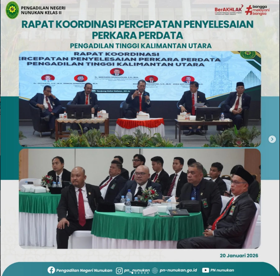 Rapat Koordinasi Percepatan Penyelesaian Perkara Perdata Oleh Pengadilan Tinggi Kalimantan Utara Selasa, 27 Januari 2026 Pengadilan Negeri Nunukan telah melaksanakan kegiatan Pencanangan Pembangunan Zona Integritas menuju Wilayah Bebas dari Korupsi (WBK) dan Wilayah Birokrasi Bersih dan Melayani (WBBM) yang digelar di Ruang Sidang Utama Pengadilan Negeri Nunukan. Kegiatan ini dihadiri oleh unsur Forkopimda Kabupaten Nunukan, […]