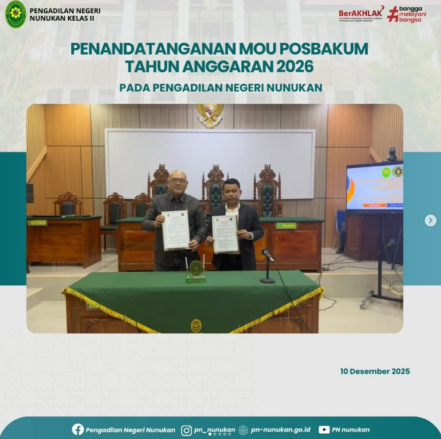 Penandatanganan Memorandum of Understanding (MoU) antara Pengadilan Negeri Nunukan dengan Lembaga Bantuan Hukum Talawang Borneo untuk kegiatan Pos Bantuan Hukum (POSBAKUM) Tahun 2026 Rabu, 10 Desember 2025 Bertempat di Ruang Sidang Utama Pengadilan Negeri Nunukan, telah dilaksanakan Penandatanganan Memorandum of Understanding (MoU) antara Pengadilan Negeri Nunukan dengan Lembaga Bantuan Hukum Talawang Borneo untuk kegiatan Pos […]