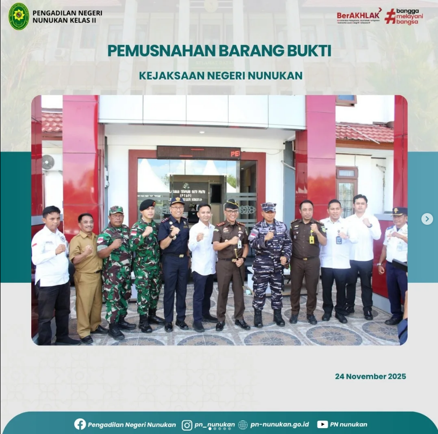 Pemusnahan Barang Bukti yang telah mempunyai Kekuatan Hukum tetap Senin, 24 November 2025 Bertempat di Halaman Kantor Kejaksaan Negeri Nunukan, Hakim Pengadilan Negeri Nunukan Bapak Ridwan Syaleh, S.H. menghadiri agenda Pemusnahan Barang Bukti yang telah mempunyai Kekuatan Hukum tetap (inkracht). Agenda dipimpin langsung oleh Kepala Kejaksaan Negeri Nunukan Bapak Burhanuddin, S.H. Barang bukti yang dimusnahkan […]